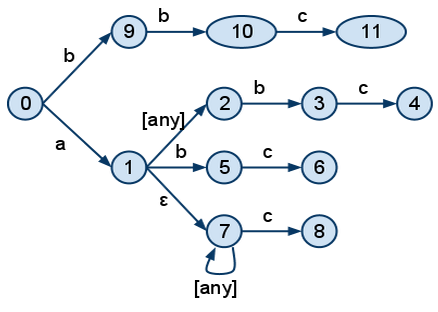 For example, the patterns "a.b.c", "a.*.b.c", "a.#.c", "b.b.c" would be represented in an NFA like this: